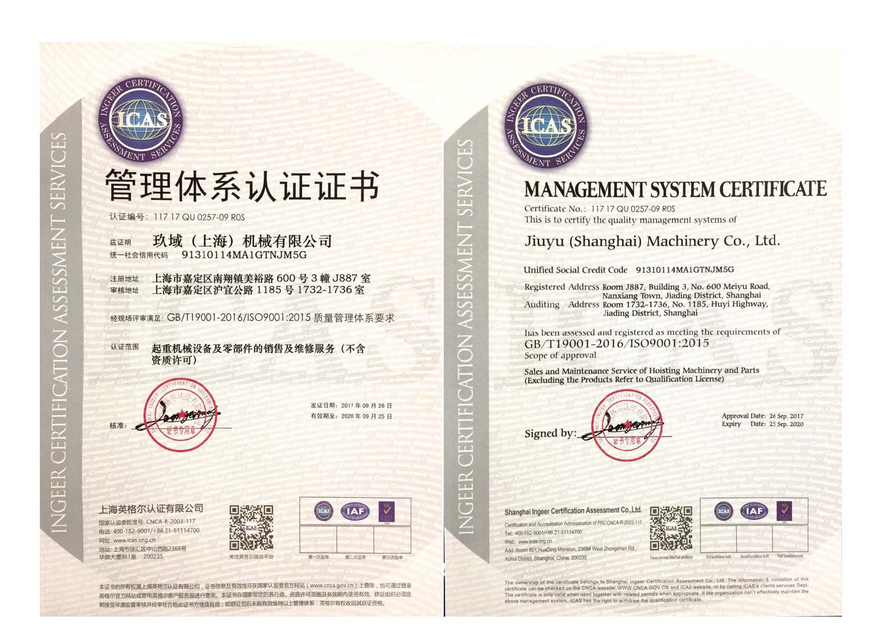 玖域(上海)機(jī)械有限公司于2018年5月28日正式獲得國(guó)家知識(shí)產(chǎn)權(quán)局頒發(fā)的“玖域/JIUYU”商標(biāo)注冊(cè)證。