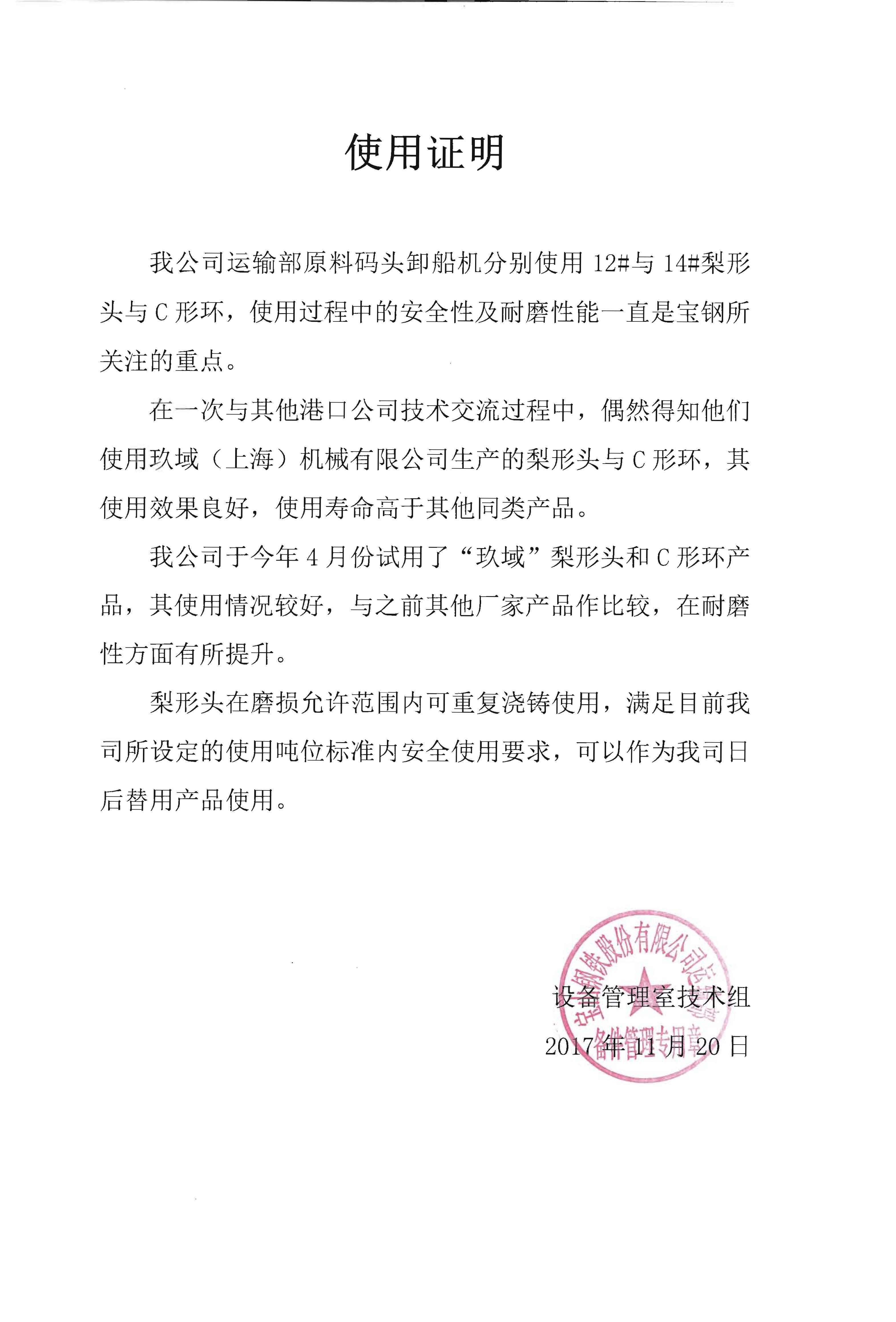 文章作者:玖域(上海)機(jī)械有限公司 上傳更新:2017-11-27寶鋼股份有限公司運(yùn)輸部原料碼頭卸船機(jī)分別使用我公司12#及14#梨形頭及C型環(huán),使用效果良好,使用壽命高于其它同類產(chǎn)品.使用至今半年多,未發(fā)生任何安全事故,據(jù)現(xiàn)場(chǎng)反饋穩(wěn)定可靠,在使用壽命上,相比以前的產(chǎn)品有較大幅度的提升,梨形頭已反復(fù)澆鑄多次,從磨損程度上看,還可繼續(xù)重復(fù)再次使用,得到碼頭點(diǎn)檢的好評(píng)!